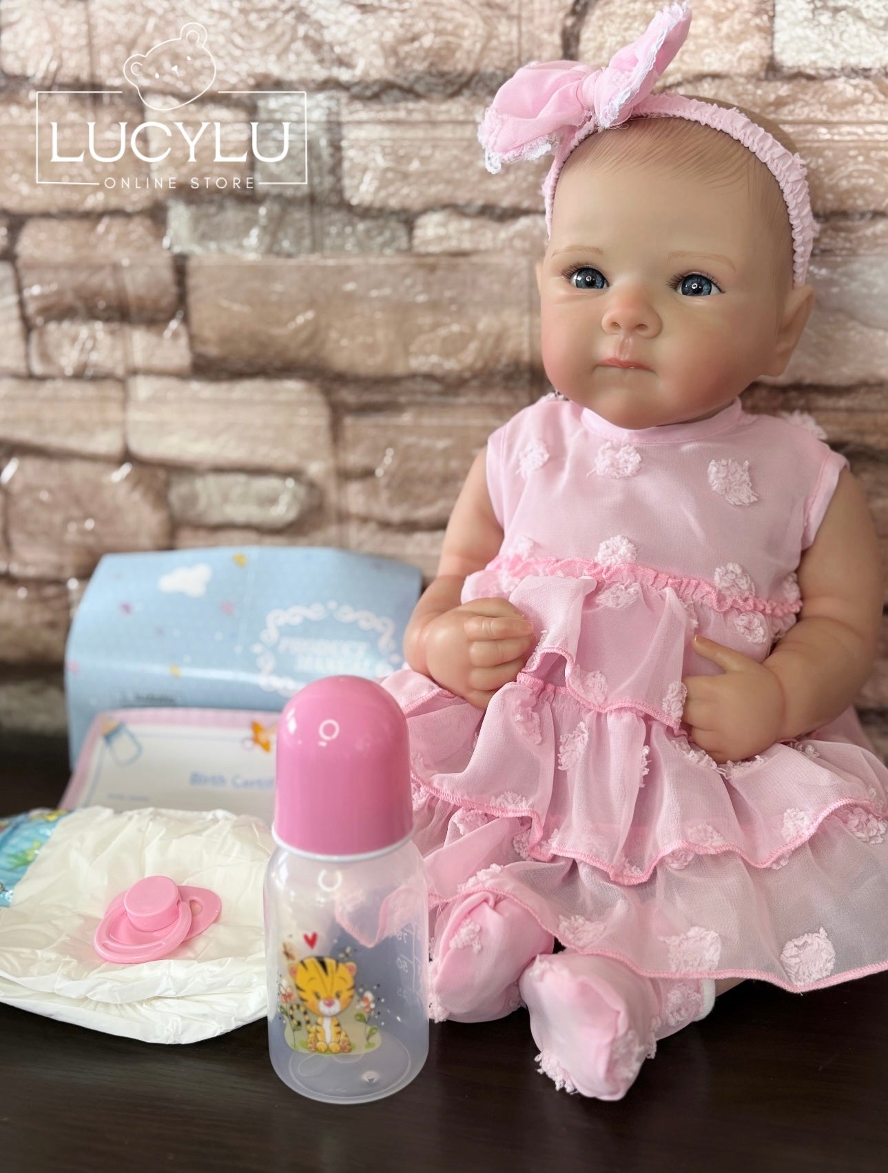 Incluye: vestimenta de la foto, chupeta magnética, biberón, pañal, certificado y caja original.