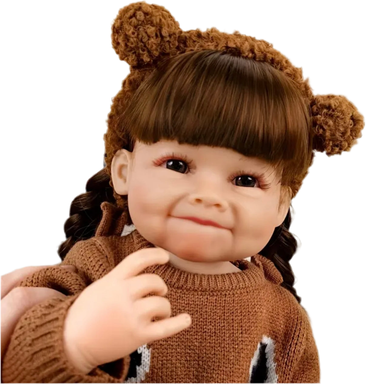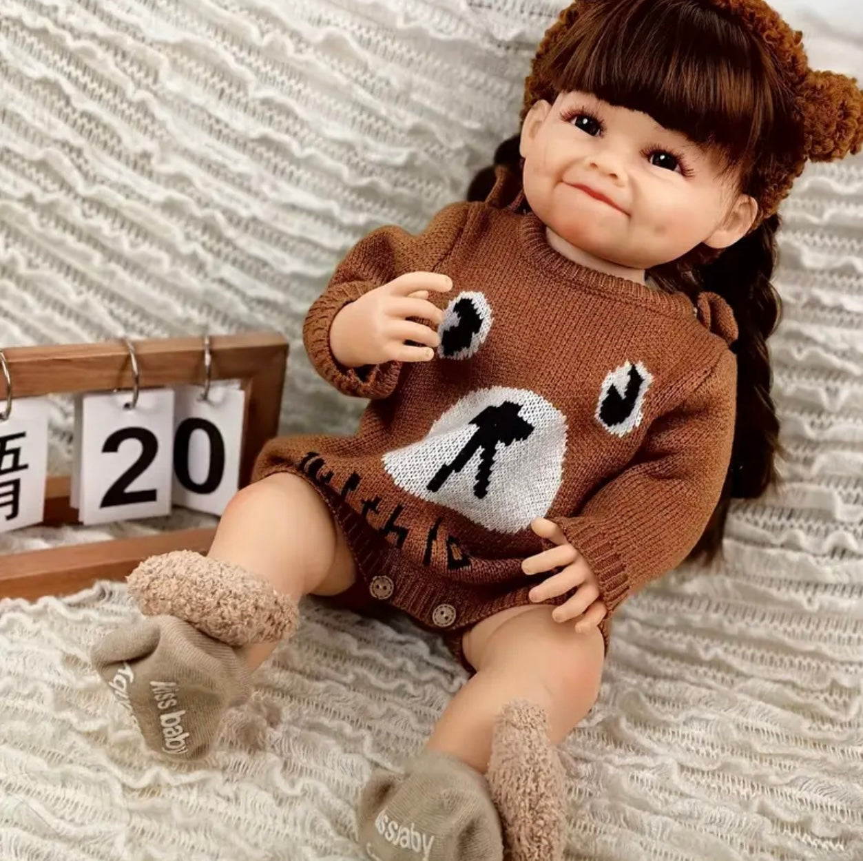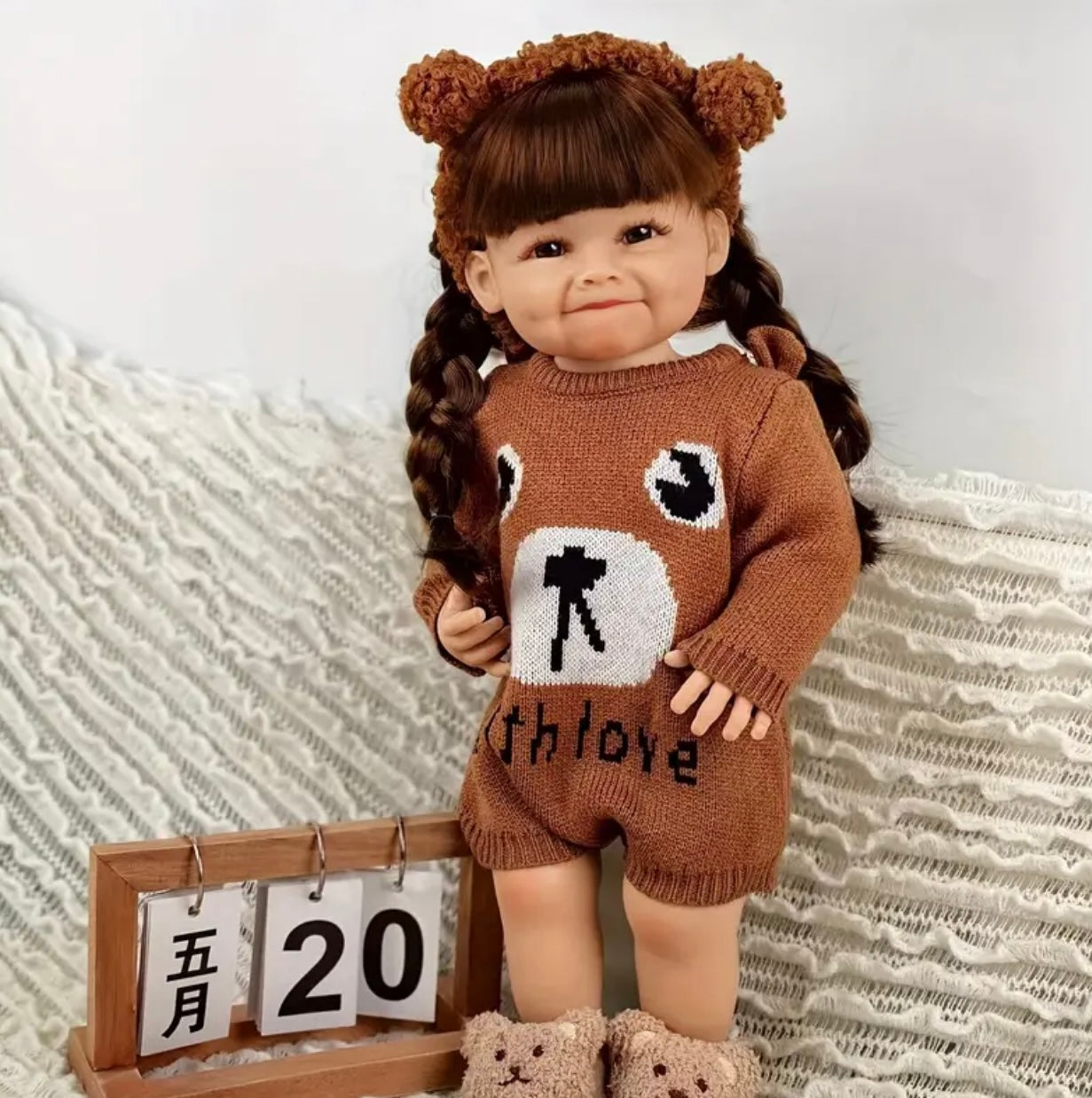 Muñeca niña con ropita de oso café, incluye un biberón, una chupeta, tarjeta de nacimiento y caja.