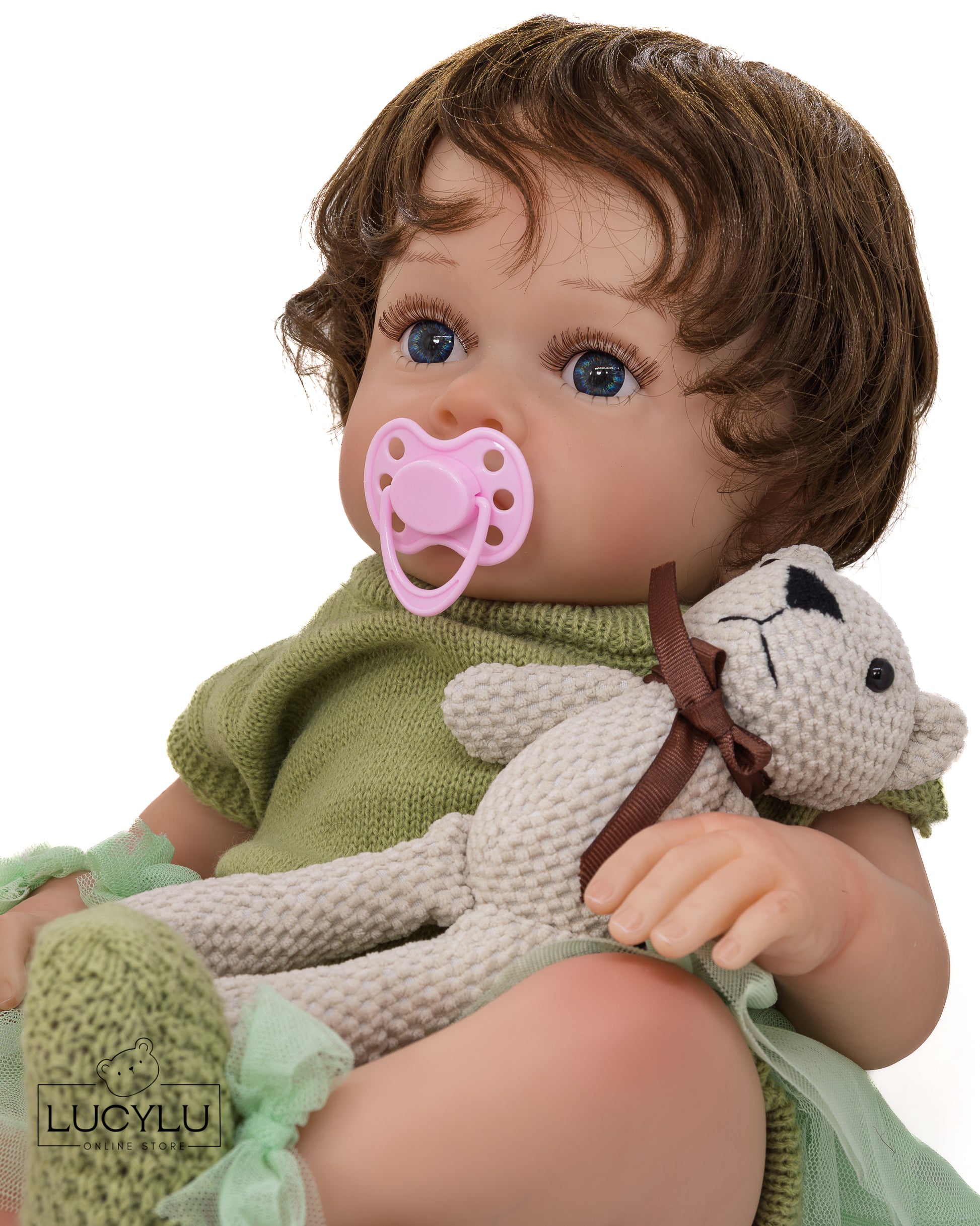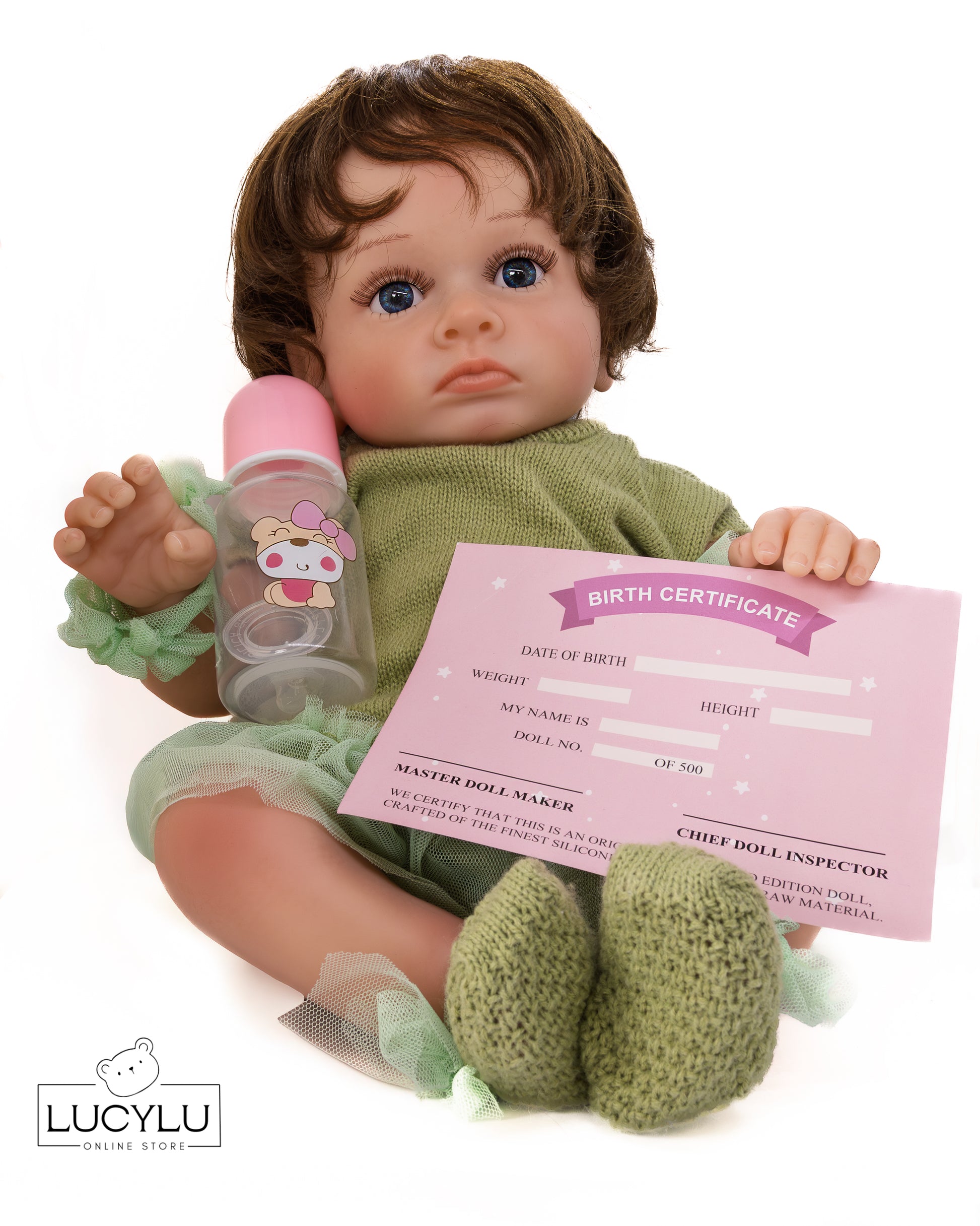 Incluye: cobija, vestido de tela, zapatos de tela, peluche, certificado de nacimiento y autenticidad, chupon, chupeta y caja.