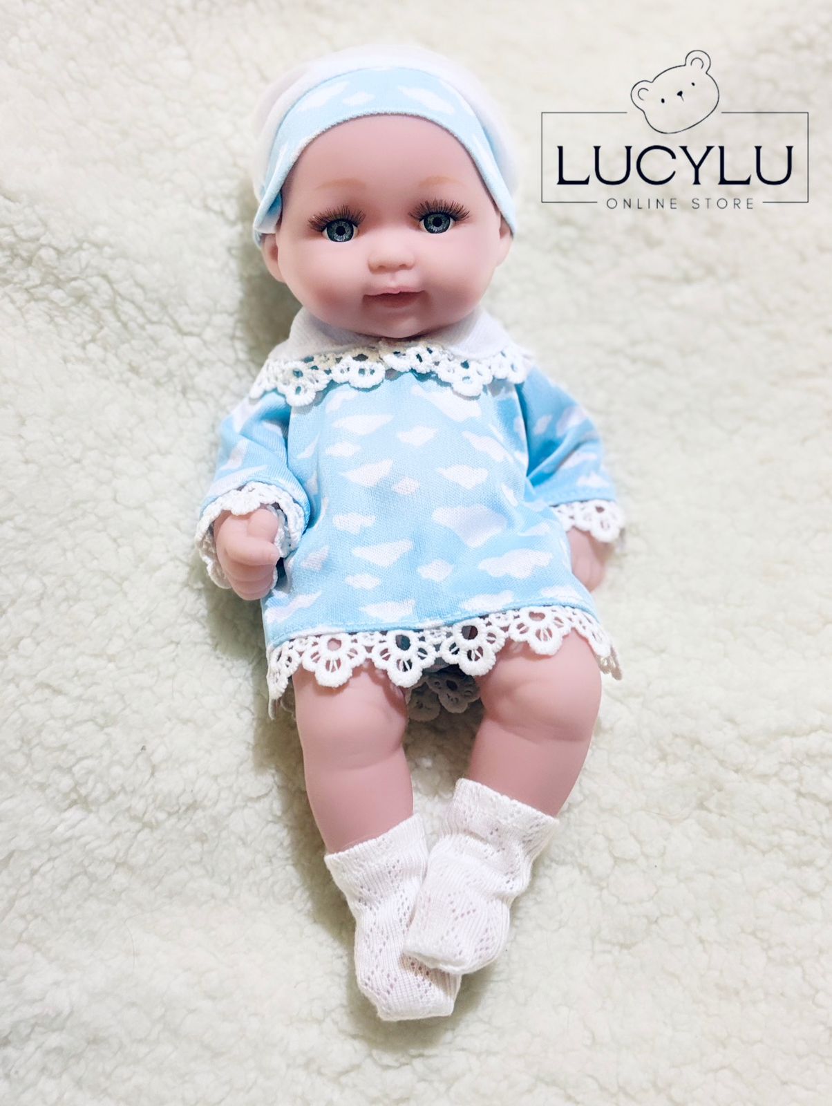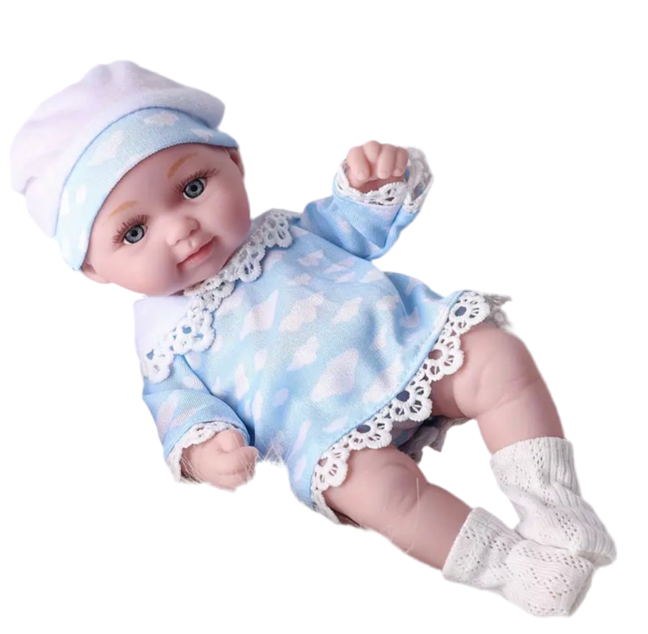 Hermosa muñeca de vinilo suave cuerpo completo, con su vestidito celeste, gorrito, medias y calzoncito de tela.