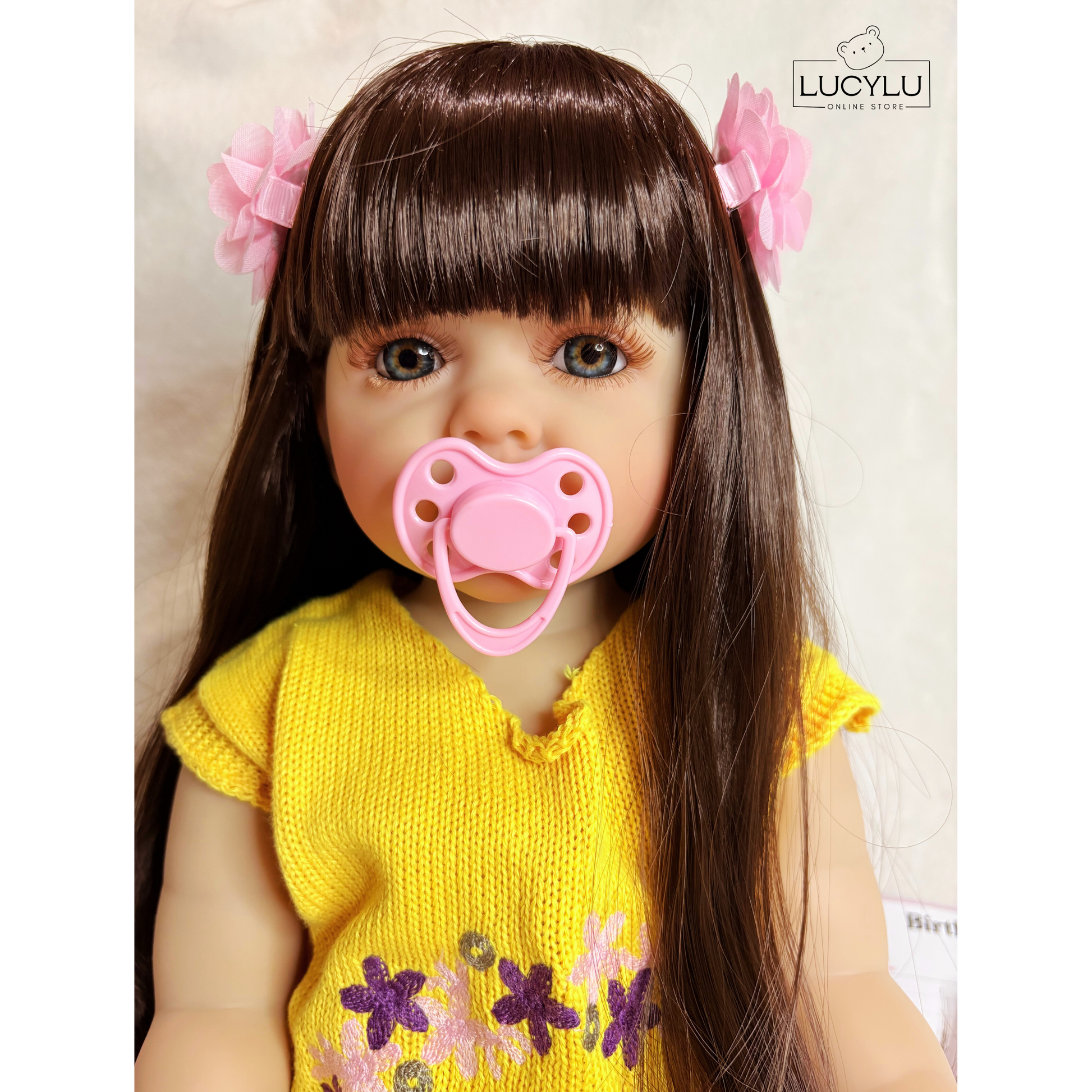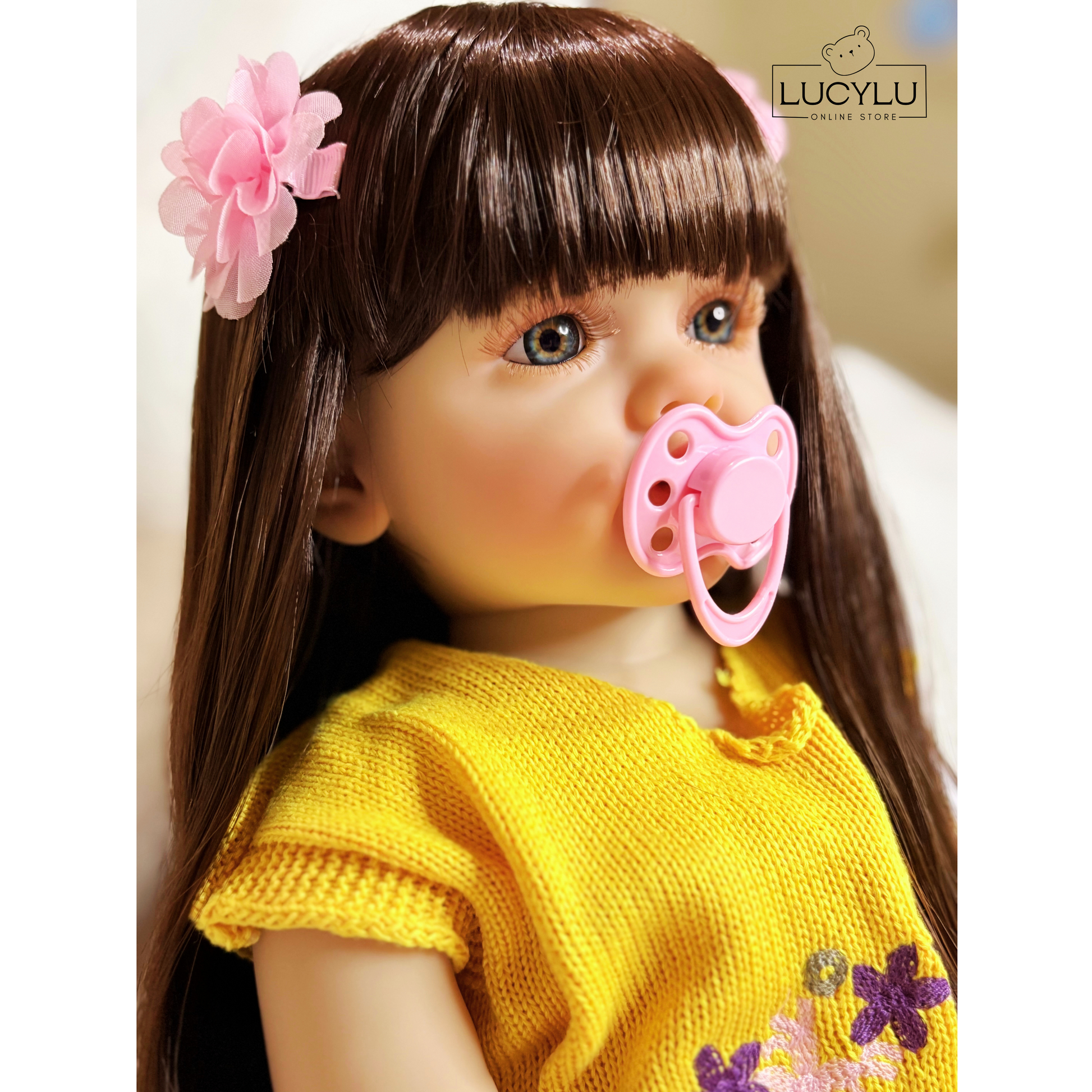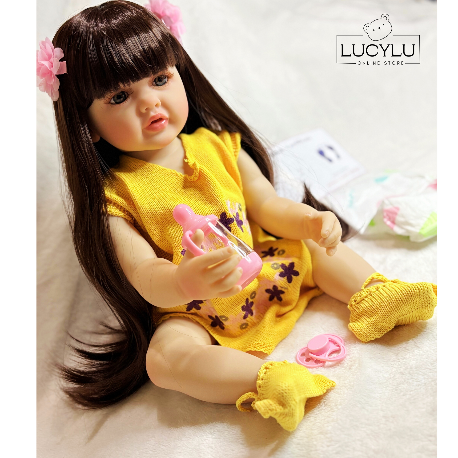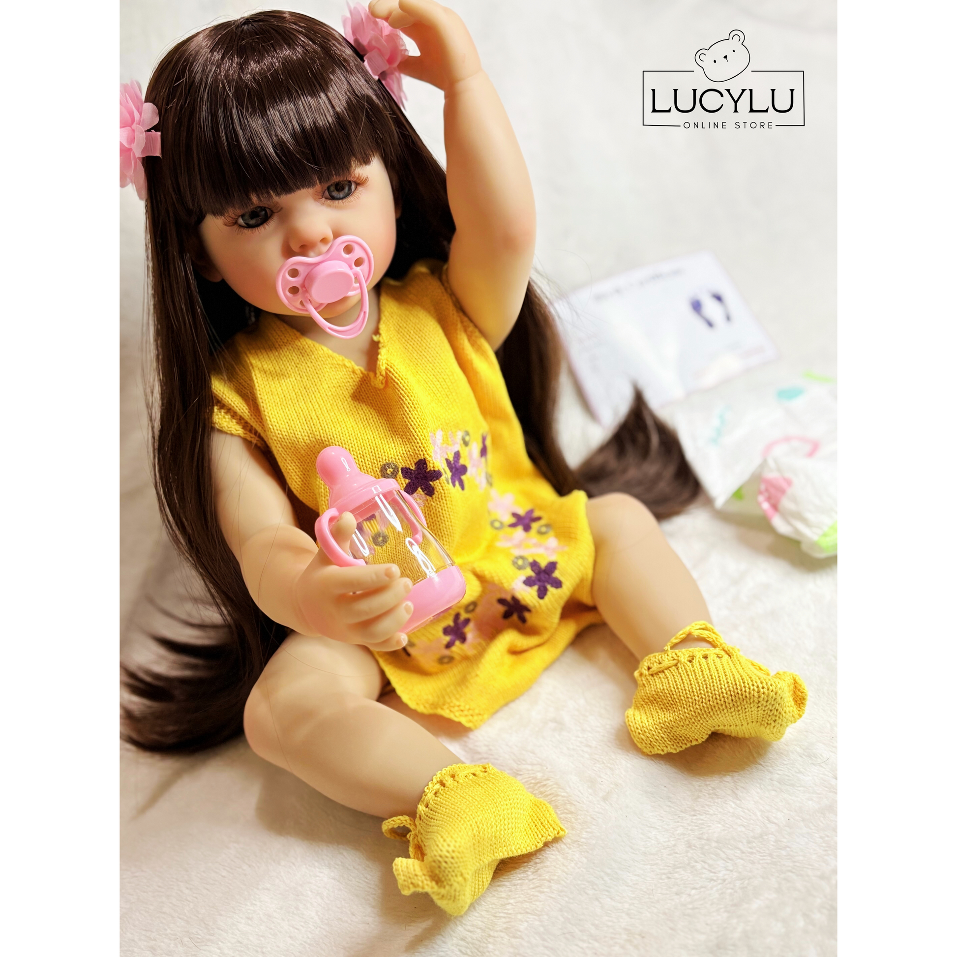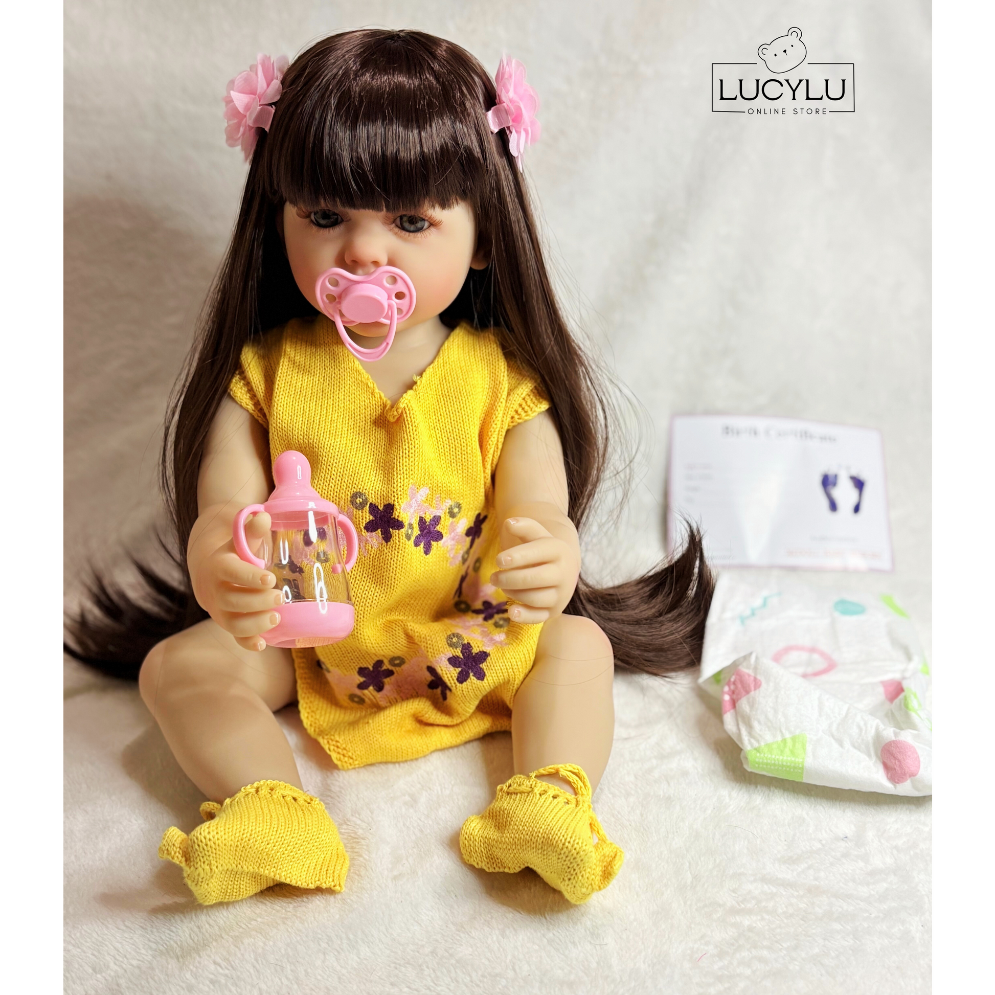Incluye: chupeta, biberón, ropita amarilla, zapatos tejidos, pañal, prensas del cabello, certificado y caja.